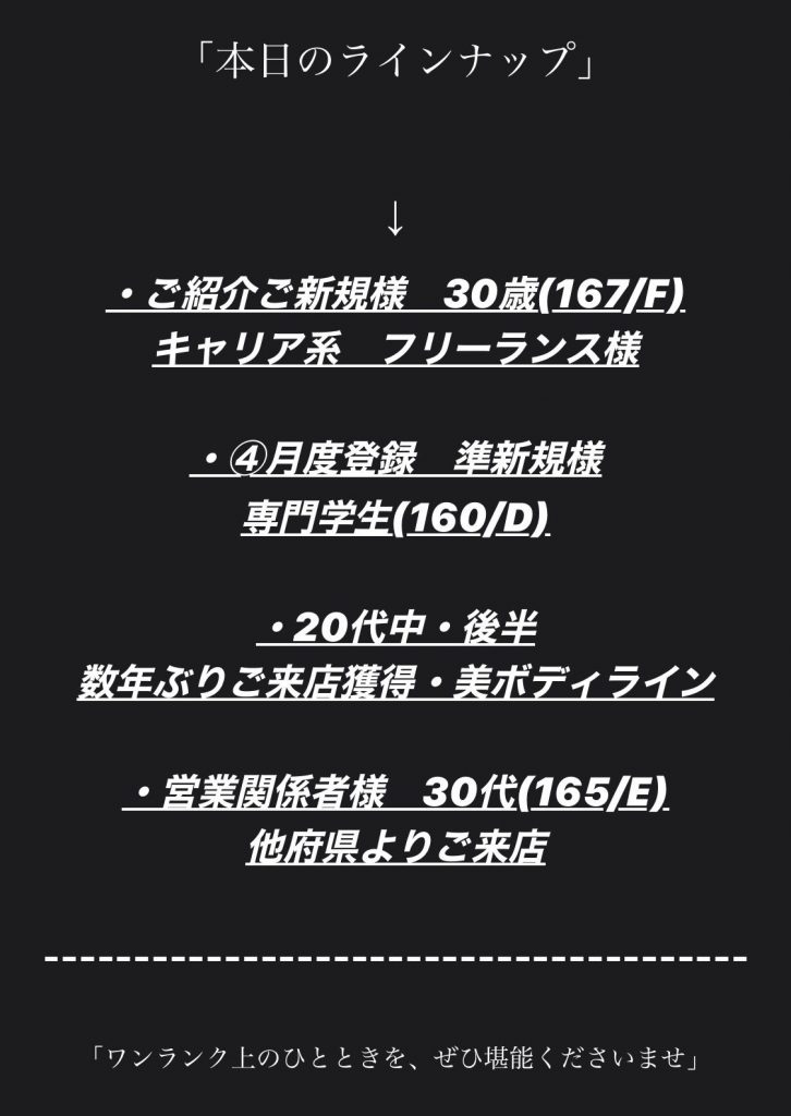 当店に遊びに来られる女性の方は、純粋で真面目で、そして真剣に素敵な出会いを求めて来店される方ばかりです!!ですから当店での出会いで、友達や恋人、そして結婚を獲得された方も多数いらっしゃいます☆勿論、遊び感覚で、一時の快楽を色んな意味で得たいと思って来店されてる女性も多数いらっしゃいますので!是非ともトキメキや幸せな日々を得て頂く為の!ご来店を心より、お待ちしております。
